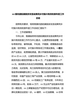 xx镇巩固脱贫攻坚成果同乡村振兴有效衔接工作开展情况的汇报按照安排,现就xx镇巩固脱贫攻坚成果同乡村振兴有效衔接工作进展情况汇报如下:一、工作进展情况今年以来,xx镇认真贯彻落实各级巩固拓展脱贫攻坚成果同乡村振兴有效衔接工作部署,聚焦重点、扎实举措,做强特色、补齐短板,全面抓好驻村帮扶、产业、就业、人居环境、乡村治理、问题整改等各项重点工作,坚决守住不发生规模性返贫底线,有效巩固拓展脱贫攻坚成果,全力推进乡村振兴。(一)健全体制机制,凝聚镇村合力。镇级层面成立巩固拓展脱贫攻坚成果同乡村振兴有效衔接议事协调机构、防返贫监测和动态帮扶专班等,村级层面成立领导小组,制定印发工作实施方案,形成了横向到...