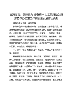 交流发言:学以致用善作善成“为打造战斗机”关、奉献机关、活力机关贡献个人力量尊敬的各位领导、各位同事:今天有幸站在这里,内心诚惶诚恐,我深知自己离一名标兵的要求还相差甚远,是你们以包容之心和爱护之情,给予我这份荣誉,也是希望通过激励,让我走得更稳、干得更好。在此,对各位领导和同事们表示最诚挚的感谢!现将个人在市政府办公室工作以来的几点体会和收获向大家做一汇报,不妥...