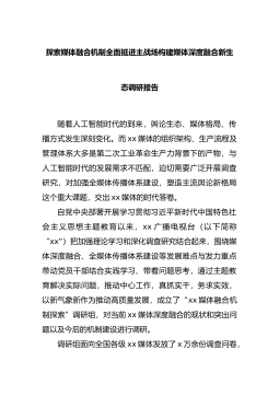 探索媒体融合机制全面挺进主战场构建媒体深度融合新生态调研报告随着人工智能时代的到来,舆论生态、媒体格局、传播方式发生深刻变化。而xx媒体的组织架构、生产流程及管理体系大多是第二次工业革命生产力背景下的产物,与人工智能时代的发展需求不匹配,迫切需要广泛开展调查研究,对加强全媒体传播体系建设,塑造主流舆论新格局这个重大课题,交出xx媒体的时代答卷。自党中央部署开展学习贯彻习近平新时代中国特色社...