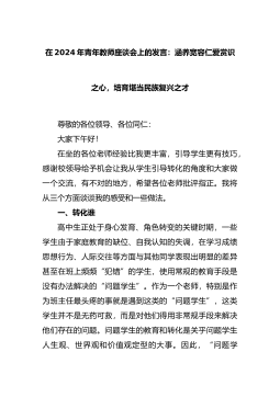 在2024年青年教师座谈会上的发言:涵养宽容仁爱赏识之心,培育堪当民族复兴之才尊敬的各位领导、各位同仁:大家下午好!在坐的各位老师经验比我更丰富,引导学生更有技巧,感谢校领导给予机会让我从学生引导转化的角度和大家做一个交流,有不对的地方,希望各位老师批评指正。我将从三个方面谈谈我的感受和一些做法。一、转化谁高中生正处于身心发育、角色转变的关键时期,一些学生由于家庭教育的缺...
