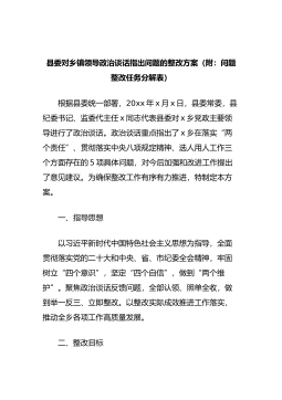 县委对乡镇领导政治谈话指出问题的整改方案(附:问题整改任务分解表)根据县委统一部署,20xx年x月x日,县委常委,县纪委书记、监委代主任x同志代表县委对x乡党政主要领导进行了政治谈话。政治谈话重点指出了x乡在落实“两个责任”、贯彻落实中央八项规定精神、选人用人工作三个方面存在的5项具体问题,对今后加强和改进工作提出了意见建议。为确保整改工作有序有力推进,特制定本方案。一、指导思想以习近平...
