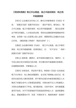 【写材料用典】策之不以其道,食之不能尽其材,鸣之而不能通其意【例文】以正确方法引导人才。唐代文学家韩愈在《马说》中说:“其真无马邪?其真不知马也!”面对千里马,喂马的人“策之不以其道,食之不能尽其材,鸣之而不能通其意”,是无法发挥出千里马天赋的。人才成长的过程,有时也会遇到各种困难挫折和考验,会导致一些人在思想上陷入迷茫,需要领导以正确的方法加以引导。(解放军报《有感于“良匠无弃材”...