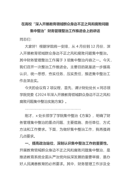 在高校“深入开展教育领域群众身边不正之风和腐败问题集中整治”财务管理整治工作推进会上的讲话同志们:大家好!根据学院统一安排,从4月份到12月份,深入开展教育领域群众身边不正之风和腐败问题集中整治。其中财务管理整治工作属于3项集中整治内容之一。今天,我们召开一次整治工作推进会。主要目的就是进一步提高认识,统一思想,夯实任务,压实责任,推进集中整治工作走深走实。今天的会...
