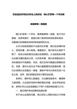 在省适应性考试分析会上的讲话:精心盯紧每一个学生精准教解每一类题解精心盯紧每一个学生,精准教解每一类题,助力均分提高,优秀率提升,是我们每个教师的神圣职责和使命,也是我们实现既定目标的有效途径和方法。从本次检测成绩的不全面对比来看,我们应该满怀信心,坚定执着,奋斗到底。数据显示,我们的均分虽然下降了,但优分段的情况还是比较理想的。从当前现实来看社会更注重的是优分段,从形势来看,我...