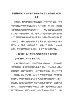 探析新形势下高校大学生思想政治教育存在的问题及对策思考近年来,虽然我国高校整体教学水平正不断提高,但目前的高校大学生思想政治教育仍存在着一些问题,思想政治教育也仍是教育领域的薄弱环节。为了能够切实提高高校思想政治教育效果,中共中央办公厅与国务院办公厅出台了《关于深化新时代学校思想政治理论课改革创新的若干意见》,这也为我国高校大学生思想政治教育的推进指明了方向。因此,各高校应充分落实“立德树人”的教...