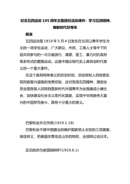 纪念五四运动105周年主题团日活动课件:学习五四精神,做新时代好青年前言五四运动是1919年5月4日发生在北京以青年学生为主的一场学生运动,广大群众、市民、工商人士等中下阶层共同参与的一次示威游行、请愿、罢工、暴力对抗政府等多形式的爱国运动。这是中国近现代史上具有划时代意义的一个重大事件。在这个具有特殊意义的历史时刻,总结党和人民探索实现民族复兴道路的宝贵经验,这对发扬五四精神,激励全党全...