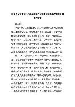 县委书记在平安XX建设表扬大会暨平安建设工作推进会议上的讲话同志们:今天开会,主要目的是,深入学习贯彻习近平法治思想和总体国家安全观,深学笃用习近平总书记关于平安中国建设的重要论述,全面贯彻落实中央、省委、州委政法工作会议精神,总结成绩、表彰先进、分析形势,系统部署今年平安建设工作,进一步动员和激励全县上下再接再厉、砥砺前行,齐心协力建设更高水平的平安XX、法治XX,为全县高质量发展和现代...