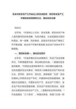 在全市安全生产工作会议上的交流发言:抓好安全生产工作要加快实现预防为主,强化综合治理 同志们:近年来,*市坚持以人为本、安全发展,把安全生产纳入富民强市的总体战略,与经济建设、社会发展各方面同时规划、统一部署、同步推进,促使全市安全生产基础工作不断加强,安全生产环境不断改善,安全生产总体水平不断提高。一、坚持安全第一,强化安全意识近年来,*市政府强化安全发展意识...