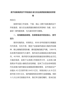 勇于创新真抓实干开拓奋进奋力交出高质量发展的优异答卷同志们:按照市委工作安排,下面,我以《勇于创新真抓实干开拓奋进,奋力交出高质量发展的优异答卷》为题,给大家讲一堂专题党课,与大家共同学习提高。一、向海图强启新程,在感恩奋进中坚定信心、坚守定力我市向海而生、听涛而立,8000多年的海洋文明基因代代传承、生生不息,塑造了这座城市逐浪大海的开拓精神、移山填海的坚韧执着、勇闯蓝海的豪迈气概。1984...