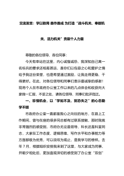 交流发言:学以致用善作善成为打造“战斗机关、奉献机关、活力机关”贡献个人力量尊敬的各位领导、各位同事:今天有幸站在这里,内心诚惶诚恐,我深知自己离一名标兵的要求还相差甚远,是你们以包容之心和爱护之情给予我这份荣誉,也是希望通过激励,让我走得更稳、干得更好。在此,对各位领导和同事们表示最诚挚的感谢!现将个人在市政府办公室工作以来的几点体会和收获向大家做一汇报,不妥之处,请各位领导...