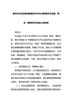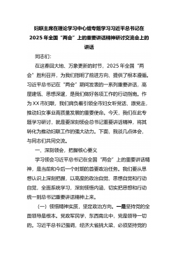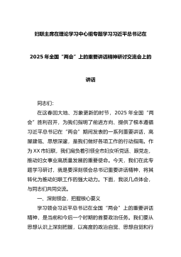 妇联主席在理论学习中心组专题学习习近平总书记在2025年全国“两会”上的重要讲话精神研讨交流会上的讲话同志们:在这春回大地、万象更新的时节,2025年全国“两会”胜利召开,为我们指明了前进方向、提供了根本遵循。习近平总书记在“两会”期间发表的一系列重要讲话,高屋建瓴、思想深邃,是我们做好各项工作的行动指南。作为XX市妇联,我们肩负着引领全市妇女听党话、跟党走,推动妇女