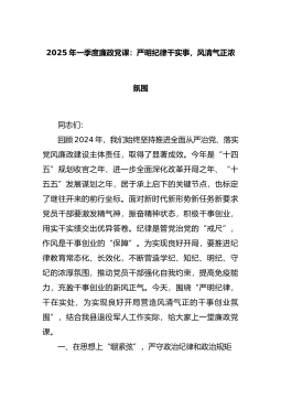 2025年一季度廉政党课讲稿:严明纪律干实事,风清气正浓氛围(退役军人)同志们:回顾2024年,我们始终坚持推进全面从严治党、落实党风廉政建设主体责任,取得了显著成效。今年是“十四五”规划收官之年、进一步全面深化改革开局之年、“十五五”发展谋划之年,居于承上启下的关键节点,也标定了继往开来的前行坐标。面对新时代新形势新任务新要求,党员干部要激发精气神,振奋精神状态,积极干事