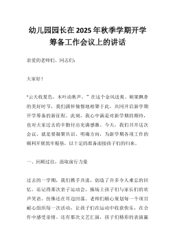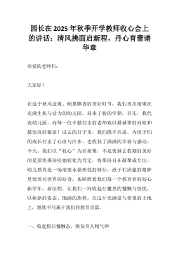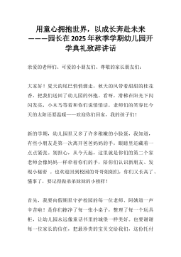 用童心拥抱世界,以成长奔赴未来———园长在2025年秋季学期幼儿园开学典礼致辞讲话亲爱的老师们、可爱的小朋友们、尊敬的家长朋友们:大家好!夏天的尾巴悄悄溜走,秋天的风带着甜甜的桂花香,把我们送回了幼儿园的怀抱。看呀,滑梯在阳光下闪闪发亮,小木马等着和你们说悄悄话,老师们的笑容比今天的太阳还要温暖——欢迎你们回家,我的孩子们!新的学期,幼儿园里又多了许多稚嫩的小脸蛋,我知道,