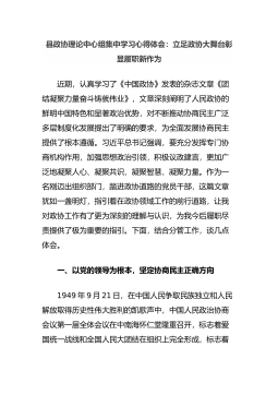 县政协理论中心组集中学习心得体会:立足政协大舞台彰显履职新作为近期,认真学习了《中国政协》发表的杂志文章《团结凝聚力量奋斗铸就伟业》,文章深刻阐明了人民政协的鲜明中国特色和显著政治优势,对不断推动协商民主广泛多层制度化发展提出了明确的要求,为全面发展协商民主提供了根本遵循。习近平总书记强调,要充分发挥专门协商机构作用,加强思想政治引领,积极议政建言,更加广泛地凝聚人心、凝聚共识、凝