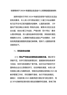 乡镇领导干部2024年度专题民主生活会、组织生活会对照检查材料(四个带头+反面典型案例剖析)根据市委《关于召开2024年度民主生活会的通知》有关要求和镇党委相关工作部署,我紧紧围绕本次民主生活会主题,结合自身实际情况,认真对照“四个带头”,全面深入查摆了自身存在的突出问题,认真分析了问题产生的原因,逐项明确了下一步整改措施。按照会议安排,现将个人对照检查情况汇报如下。一