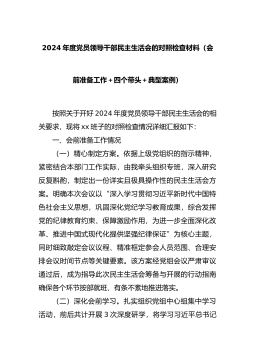2024年度党员领导干部民主生活会的对照检查材料(会前准备工作+四个带头+典型案例)按照关于开好2024年度党员领导干部民主生活会的相关要求,现将xx班子的对照检查情况详细汇报如下:一、会前准备工作情况(一)精心制定方案。依据上级党组织的指示精神,紧密结合本部门工作实际,由我牵头组织专班,深入研究反复斟酌,制定出一份详实且极具操作性的民主生活会方案。明确本次会议以“深入学