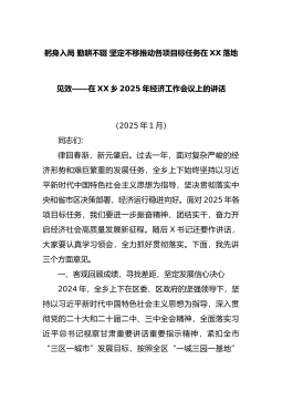 躬身入局勤耕不辍坚定不移推动各项目标任务在XX落地见效——在XX乡2025年经济工作会议上的讲话(2025年1月)同志们:律回春渐,新元肇启。过去一年,面对复杂严峻的经济形势和艰巨繁重的发展任务,全乡上下始终坚持以习近平新时代中国特色社会主义思想为指导,坚决贯彻落实中央和省市区决策部署,经济运行稳进向好。面对2025年各项目标任务,我们要进一步振奋精神、