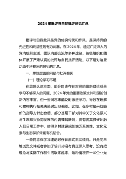 民主生活会(组织生活会)自我批评和相互批评意见34条(含例子问题清单)民主生活会(组织生活会)自我批评和相互批评意见(34条)1.理论学习不够系统深入。虽然通过党组第一议题、理论中心组学习等形式开展学习,但学习质量不高。比如,党的二十届三中全会召开后,对《决定》提出的进一步全面深化改革的指导思想、总体要求等重要论述理解把握不够,存在囫囵吞枣、浅尝辄止的问题。在分管部门的学习