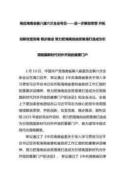 响应海南省委八届六次全会号召——进一步解放思想开拓创新攻坚克难稳步推进努力把海南自由贸易港打造成为引领我国新时代对外开放的重要门户1月10日,中国共产党海南省第八届委员会第六次全体会议在海口召开,审议通过《中共海南省委关于深入学习贯彻习近平总书记在听取海南省委和省政府工作汇报时的重要讲话精神、努力把海南自由贸易港打造成为引领我国新时代对外开放的重要门户的
