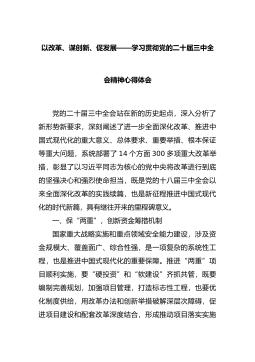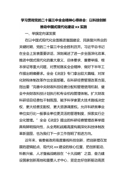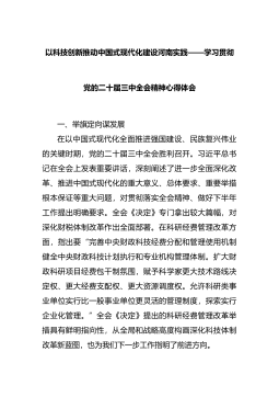 以科技创新推动中国式现代化建设河南实践——学习贯彻党的二十届三中全会精神心得体会一、举旗定向谋发展在以中国式现代化全面推进强国建设、民族复兴伟业的关键时期,党的二十届三中全会胜利召开。习近平总书记在全会上发表重要讲话,深刻阐述了进一步全面深化改革、推进中国式现代化的重大意义、总体要求、重要举措根本保证等重大问题,对贯彻落实全会精神、做好下半年工作提出明确要求。全会《决定》专门拿出较