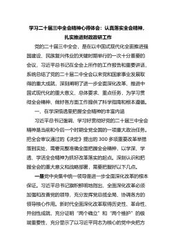学习二十届三中全会精神心得体会:认真落实全会精神,扎实推进财政政研工作党的二十届三中全会,是在以中国式现代化全面推进强国建设、民族复兴伟业的关键时期举行的一次十分重要的会议,习近平总书记在全会上所作的工作报告和重要讲话,系统总结了党的二十届二中全会以来党和国家事业发展取得的重大成就,深刻阐明了进一步全面深化改革、推进中国式现代化的重大意义、总体要求、重点任务,为学习贯彻全会精神、