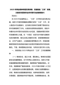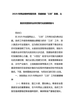 2025年两会精神专题党课讲稿:党建赋能“三农”发展,从脱贫攻坚到农业农村现代化的接续奋斗同志们:在2025年全国两会上,“三农”工作再次成为焦点议题。政府工作报告明确提出要着力抓好“三农”工作,深入推进乡村全面振兴,这为我们在新时代背景下推动农业农村发展指明了方向。从脱贫攻坚取得全面胜利,到如今向着农业农村现代化的目标大步迈进,党建始终是引领农村发展的核心力量。在“十四五