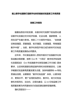 插上数字化翅膀打造数字化体系赋能纪检监察工作高质量发展工作报告随着信息技术的发展,在数字时代背景下的信息化建设数字化发展正在对经济发展、社会治理、国家管理、人民生活产生重大影响。党的二十大报告中指出,“加快建设制造强国、质量强国、航天强国、交通强国、网络强国数字中国”。当前,数字化转型升级已成为新时代纪检监察工作高质量发展的必然要求。近年来,市纪委监委深入贯彻市委关于实施数字化转...