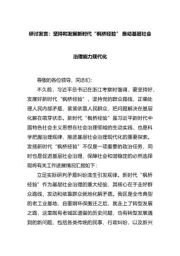 研讨发言:坚持和发展新时代“枫桥经验”推动基层社会治理能力现代化尊敬的各位领导,同志们:不久前,习近平总书记在浙江考察时强调,要坚持好、发展好新时代“枫桥经验”,坚持党的群众路线,正确处理人民内部矛盾,紧紧依靠人民群众,把问题解决在基层化解在萌芽状态。新时代“枫桥经验”是习近平新时代中国特色社会主义思想在社会治理领域的生动实践,也是科学把握治理规律、推进基层社会治理现代化的重要...