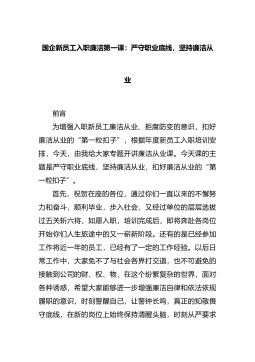 国企新员工入职廉洁第一课:严守职业底线,坚持廉洁从业前言为增强入职新员工廉洁从业、拒腐防变的意识,扣好廉洁从业的“第一粒扣子”,根据年度新员工入职培训安排,今天,由我给大家专题开讲廉洁从业课。今天课的主题是严守职业底线,坚持廉洁从业,扣好廉洁从业的“第一粒扣子”。首先,祝贺在座的各位,通过你们一直以来的不懈努力和奋斗,顺利毕业,步入社会,又经过单位的层层选拔过五关斩六将,如愿入职,培训完成后,即将...