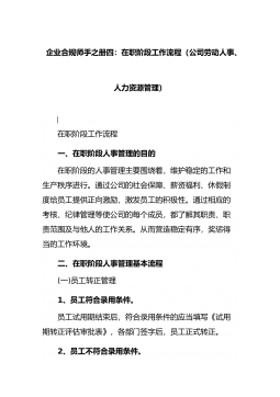 企业合规师手之册四:在职阶段工作流程(公司劳动人事、人力资源管理)在职阶段工作流程一、在职阶段人事管理的目的在职阶段的人事管理主要围绕着,维护稳定的工作和生产秩序进行。通过公司的社会保障、薪资福利、休假制度给员工提供正向激励,激发员工的积极性。通过相应的考核、纪律管理等使公司的每个成员,都了解其职责、职责范围及与他人的工作关系。从而营造稳定有序,奖惩得当的工作环境。二、在职阶段人事管理基本流程(一...