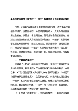 某县纪委监委关于加强对“一把手”和领导班子监督的调研报告日前,XX县纪委监委结合年度调研课题立项,成立由委主要领导任组长,分管副书记、主管常委任副组长,党风政风监督室纪检监察室、案管室、审查调查室、信访室和县委巡察机构、各派驻纪检监察组负责人为成员的关于加强对“一把手”和领导班子监督的专题调研组,通过实地走访、召开座谈会、查阅相关资料、对近几年查办的“一把手”和领导班子案件进行“回头看”等形式,总...