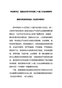 市纪委书记、监委主任学习中纪委二十届二次全会精神专题研讨发言材料结合《永远吹冲锋号》新年伊始在XX召开的二十届中央纪委六次会议,是一次新时代新征程深入推进全面从严治党作出战略部署的重要会议,习近平总书记在会上发表了重要讲话,他强调,要站在事关党长期执政、国家长治久安、人民幸福安康的高度,把全面从严治党作为党的长期战略、永恒课题,始终坚持问题导向,保持战略定力,发扬彻底的自我革命精...