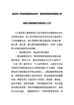 退役军人事务局典型发言材料:解放思想奋发进取用心用情用力做好新时代退役军人工作XX退役军人事局坚持以习近平新时代中国特色社会主义思想为指导,深入学习贯彻习近平总书记关于退役军人工作的重要论述,用心用情用力解决退役军人的操心事、烦心事、揪心事,着力提升服务保障能力,引导广大退役军人积极投身经济社会发展。一、强化理论学习,突出抓好政治建设一是加强理论学习。坚持用党的创新理论武装头脑、...