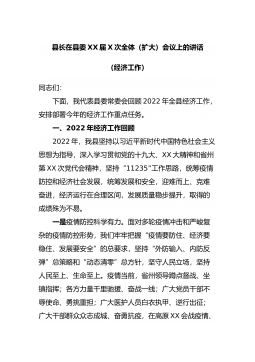 县长在县委XX届X次全体(扩大)会议上的讲话(经济工作)同志们:下面,我代表县委常委会回顾2022年全县经济工作,安排部署今年的经济工作重点任务。一、2022年经济工作回顾2022年,我县坚持以习近平新时代中国特色社会主义思想为指导,深入学习贯彻党的十九大、XX大精神和省州第XX次党代会精神,坚持“11235”工作思路,统筹疫情防控和经济社会发展,统筹发展和安全,迎难而上、克难奋进...