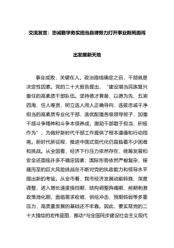 交流发言:忠诚勤学务实担当自律努力打开事业新局面闯出发展新天地事业成败,关键在人。政治路线确定之后,干部就是决定性因素。党的二十大报告提出,“建设堪当民族复兴重任的高素质干部队伍。坚持德才兼备、以德为先、五湖四海、任人唯贤,树立选人用人正确导向,选拔忠诚干净担当的高素质专业化干部,选优配强各级领导班子,加强干部斗争精神和斗争本领养成,激励干部敢于担当、积极作为”,为做好新时代干部工...