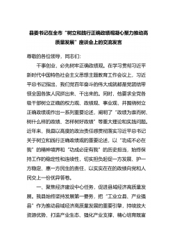 县委书记在全市“树立和践行正确政绩观凝心聚力推动高质量发展”座谈会上的交流发言尊敬的各位领导,同志们:干事创业,必先树牢正确政绩观。在学习贯彻习近平新时代中国特色社会主义思想主题教育工作会议上,习近平总书记指出,我们党百年奋斗的伟大成就都是党团结带领全国各族人民拼出来、干出来的。同时,他要求全党各级干部树立正确的权力观、政绩观、事业观,并围绕树立正确政绩观作出一系列重要论述,阐明了...