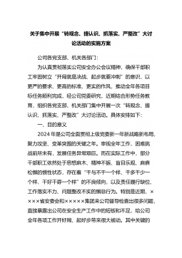 关于集中开展“转观念、提认识、抓落实、严整改”大讨论活动的实施方案公司各党支部、机关各部门:为认真贯彻落实公司安全办公会议精神,确保干部职工牢固树立“开局就是决战、起步就要冲刺”的意识,以更严的要求、更高的标准、更实的作风,推动全年各项目标任务顺利完成,经公司党委研究,近期结合形势任务教育,组织各党支部、机关部门集中开展一次“转观念、提认识、抓落实、严整改”大讨论活动。具体安排如下...