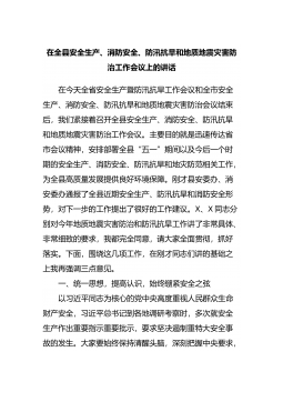 在全县安全生产、消防安全、防汛抗旱和地质地震灾害防治工作会议上的讲话在今天全省安全生产暨防汛抗旱工作会议和全市安全生产、消防安全、防汛抗旱和地质地震灾害防治会议结束后,我们紧接着召开全县安全生产、消防安全、防汛抗旱和地质地震灾害防治工作会议。主要目的就是迅速传达省市会议精神,安排部署全县“五一”期间以及今后一个时期的安全生产、消防安全、防汛抗旱和地灾防范相关工作,为全县高质量发展...