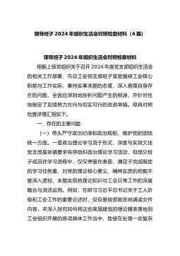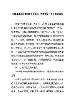 领导干部四个带头五个方面2024年组织生活会个人对照检查发言材料(意识形态工作责任制落实方面典型案例)(6篇)【一】按照党支部召开2024年组织生活会的相关要求,我沉浸式深入学习党的二十届三中全会精神,逐章逐节、逐字逐句研习党规,以及《中国共产党章程》《条例》《中国共产党支部工作条例(试行)》等一系列党内法规。在这一过程中,我对身为住房公积金党支部书记所肩负的责任与