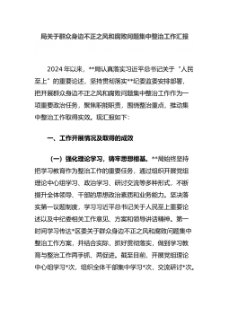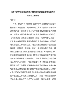 纪委书记在群众身边不正之风和腐败问题集中整治第四次调度会上的讲话同志们:今天,我们召开全县群众身边不正之风和腐败问题集中整治第四次调度会,主要任务是认真学习贯彻习近平总书记在党的二十届三中全会上所作的工作报告和重要讲话精神,跟进学习贯彻中央纪委国家监委集中整治组《通知》《六点考虑》以及省纪委监委《通知》和全市群众身边不正之风和腐败问题集中整治第四次调度会议精神,听取前期集中整治工