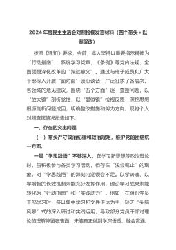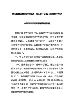 某市教育体育局党组书记、局长关于2024年度民主生活会领导班子对照检视剖析材料根据市委《关于召开2024年度民主生活会的通知》有关要求,我紧紧围绕本次民主生活会主题,结合全市教育体育工作实际,认真对照“四个带头”,全面深入查摆了工作中存在的突出问题,认真分析了问题产生的原因,逐项明确了下一步整改措施。按照会议安排,现将对照检查情况汇报如下。一、学习贯彻习近平新时代中国特色社