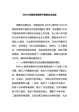 国有企业党委书记2024年民主生活会个人对照检查发言材料(上年度整改+四个带头)根据本次民主生活会的要求,我深入学习贯彻习近平新时代中国特色社会主义思想,全面贯彻党的二十届三中全会精神,紧密结合思想和工作实际,认真回顾2023年度民主生活会整改落实情况,深刻查摆自身存在的问题,深入剖析原因,明确整改措施。现将个人对照检查情况汇报如下:一、2023年度民主生活会整改落实情
