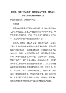 演讲稿:把牢“三大抓手”踔厉奋发大干实干,努力成为可堪大用能担重任的栋梁之才尊敬的各位领导、亲爱的同事们:大家好!很高兴也很荣幸今天能够站在这里,跟大家一同分享本人学习贯彻党的二十届三中全会精神的小小心得体会,今天我要演讲的题目是“把牢‘三大抓手’踔厉奋发大干实干,努力成为可堪大用能担重任的栋梁之才”。前不久,党的二十届三中全会于北京胜利召开,全会审议通过了《中共中央关于进一步全