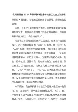 在2024年秋季开学典礼暨教师节表彰大会上的讲话:以赤诚热爱,共赴美好未来尊敬的X董事长、老师们,亲爱的同学们:惠风和畅,万象更新。今天,我们相约在这叠翠流金的大美校园,共同按下2024年秋季新学期的启动键,奏响新学年的新乐章!此刻,站在这里,我满怀激动与期待,请允许我代表学校向每一位重返校园的师生致以最诚挚的问候和最衷心的祝福!与此同时,美丽的三中校园又多了一群新的