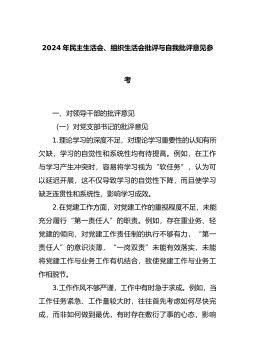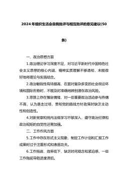 民主生活会(组织生活会)自我批评和相互批评意见34条(含例子问题清单)民主生活会(组织生活会)自我批评和相互批评意见(34条)1.理论学习不够系统深入。虽然通过党组第一议题、理论中心组学习等形式开展学习,但学习质量不高。比如,党的二十届三中全会召开后,对《决定》提出的进一步全面深化改革的指导思想、总体要求等重要论述理解把握不够,存在囫囵吞枣、浅尝辄止的问题。在分管部门的学习