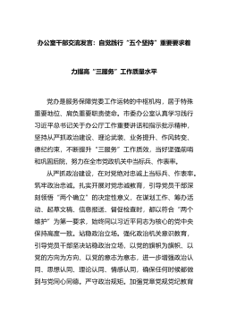 办公室干部交流发言:自觉践行“五个坚持”重要要求着力提高“三服务”工作质量水平党办是服务保障党委工作运转的中枢机构,居于特殊重要地位、肩负重要职责使命。市委办公室认真学习践行习近平总书记关于办公厅工作重要讲话和指示批示精神,坚持从严抓政治建设、理论武装、业务提升、作风转变、德纪约束,不断提升“三服务”工作质效,当好坚强前哨和巩固后院,努力在全市党政机关中当标兵、作表率。从严抓政治建...