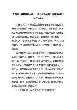 在县委“发展新质生产力,推动产业发展”专题读书班上的交流发言认真聆听了XX书记的主题报告和教授专家们的授课,为我们深刻理解、准确把握、坚决落实中央和省委、市委关于推进高质量发展和培育新质生产力要求提供了重要指引,让我受益匪浅、倍感振奋,更加坚定了加快建设XXXXXX产业强县的信心和决心。我也梳理了全县工业发展情况,今天着重围绕食品饮料产业发展,给大家分享几点思考。食品饮料产业是人类的生命工业...