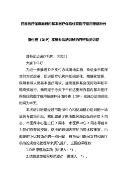 在县医疗保障局县内基本医疗保险住院医疗费用按病种分值付费(DIP)实施办法培训班的开班动员讲话县各定点医疗机构、同志们:大家下午好!为进一步推进DIP支付方式落地实施,推进全市医保支付方式改革,促进医疗机构内部规范化、精细化管理,保障参保人员基本医疗需求,提高医保基金使用效率和平稳高效运行,我局定于今天下午在这里举办县内基本医疗保险住院医疗费用按病种分值付费(DIP)实...