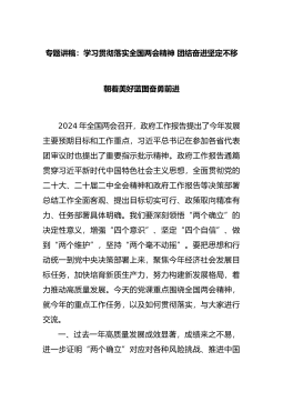 专题讲稿:学习贯彻落实全国两会精神团结奋进坚定不移朝着美好蓝图奋勇前进2024年全国两会召开,政府工作报告提出了今年发展主要预期目标和工作重点,习近平总书记在参加各省代表团审议时也提出了重要指示批示精神。政府工作报告通篇贯穿习近平新时代中国特色社会主义思想,全面贯彻党的二十大、二十届二中全会精神和政府工作报告等决策部署总结工作全面客观、提出目标切实可行、政策取向精准有力、任务部署具体明确。我们...
