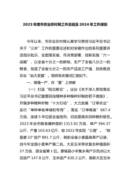 2023年度市农业农村局工作总结及2024年工作谋划今年以来,市农业农村局认真学习贯彻习近平总书记关于“三农”工作的重要论述和对安徽作出的系列重要讲话指示批示,全面落实省、市决策部署,创新实施“六一战略”,以全省十分之一的耕地,生产了全省八分之一的粮食,创造了全省七分之一的农产品加工产值,加快推进农业“由大变强”。现将有关情况汇报如下。一、做强一产,在“量”上突破(一)打造“皖北粮仓”。出台...